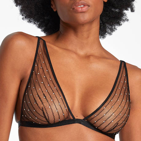 Tulle orné de strass avec des réglages modulables. Décolleté plongeant sans armature.
